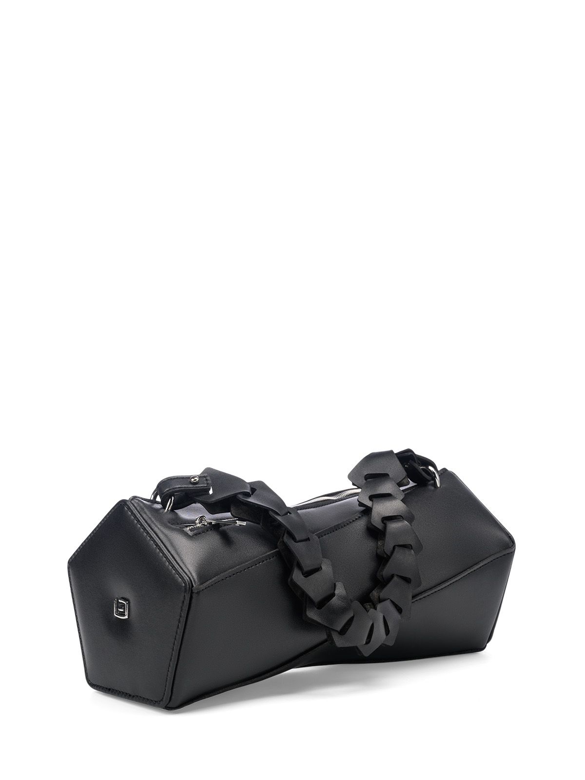 Сумка в форме цилиндра, маленького размера (S). Сумка открывается вдоль стенки с помощью молнии. Внутри одно отделение и карман на резинке, для хранения небольших предметов.