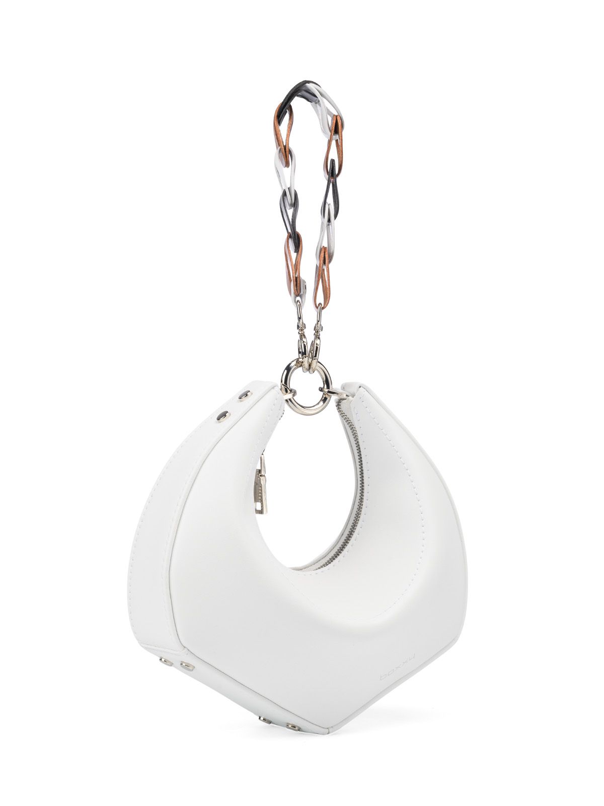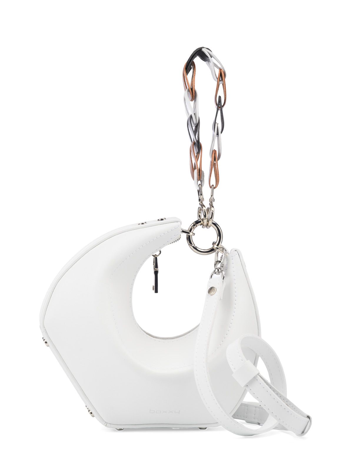 Сумка маленького размера AURA 3040 в форме месяца. Закрывается на молнию. Дно имеет выпуклую форму, установлены ножки (пукли). Внутри одно отделение. На задней стенке подклада накладной карман с резинкой. В комплект входит: съёмная ручка из кожи ввиде цепи, а так же съёмный плечевой ремень, регулируемый до 110 см.