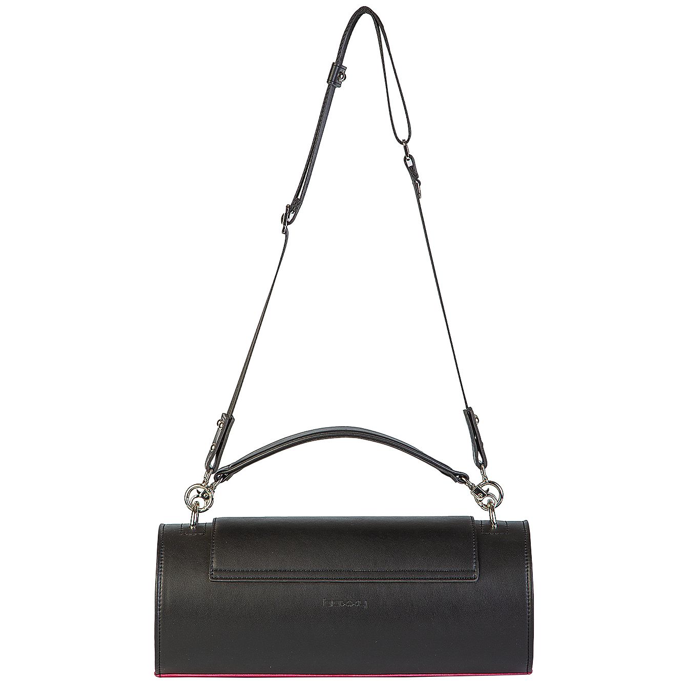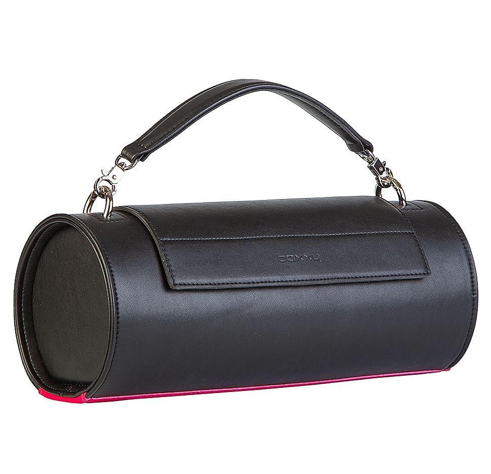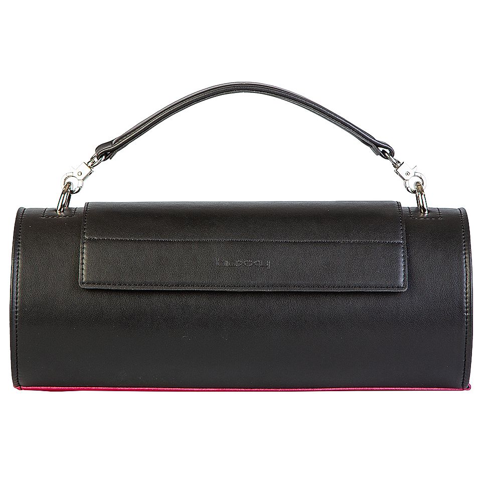 Цилиндрический силуэт и математически выверенные линии – пожалуй, одна из самых акцентных моделей бренда – это сумка BAZOOKA. Аксессуар выполнен в черной гладкой коже с контрастной вставкой цвета фуксия. Внутреннее пространство сумки обработано кожей цвета фуксия.