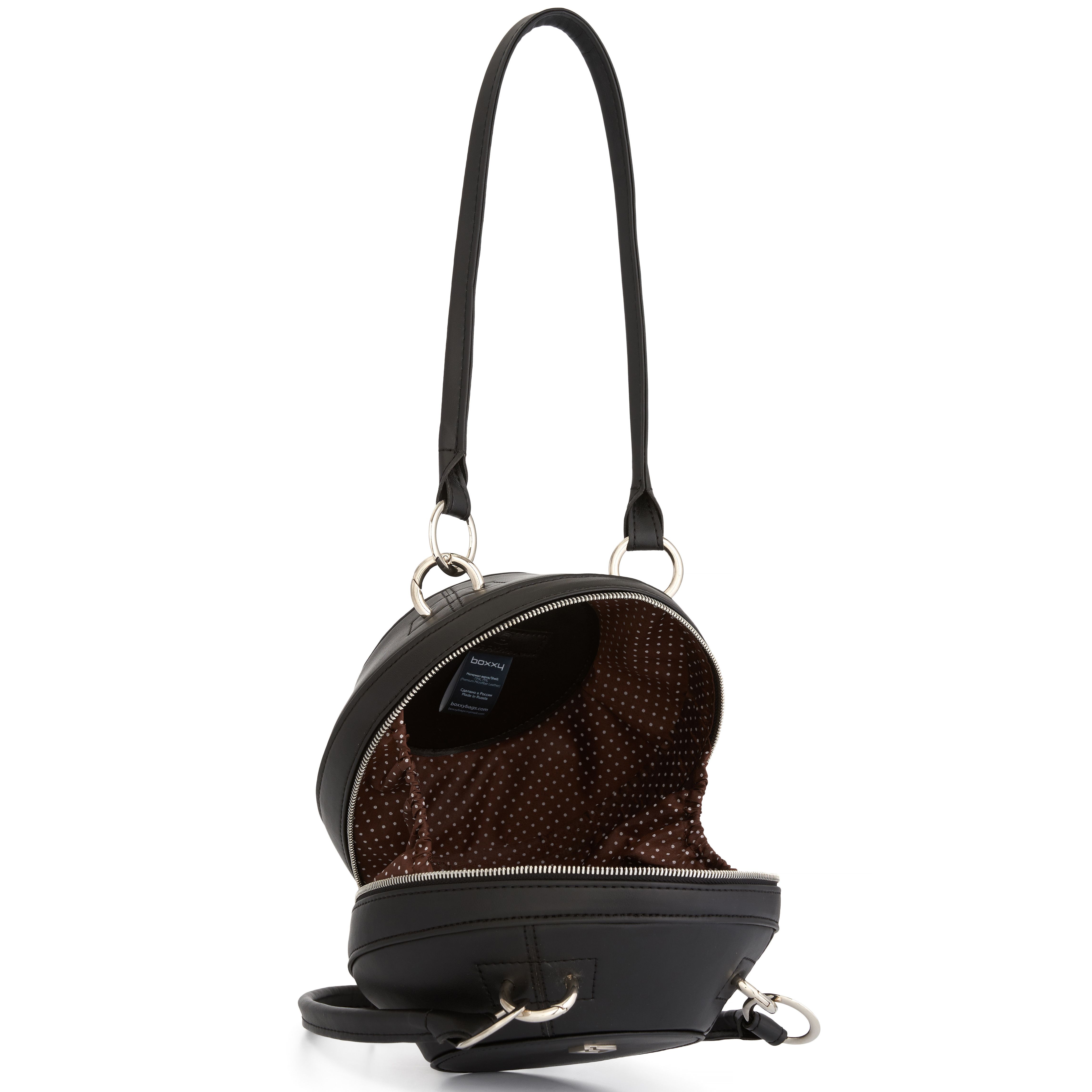 Сумка в форме шара CHERRY 2208 из гладкой черной кожи — стильный современный аксессуар среднего размера. Закрывается на молнию, ручки на передней и задней стенках закреплены при помощи металлических колец. Внутри сумки одно отделение, имеется маленький карман на подкладке.