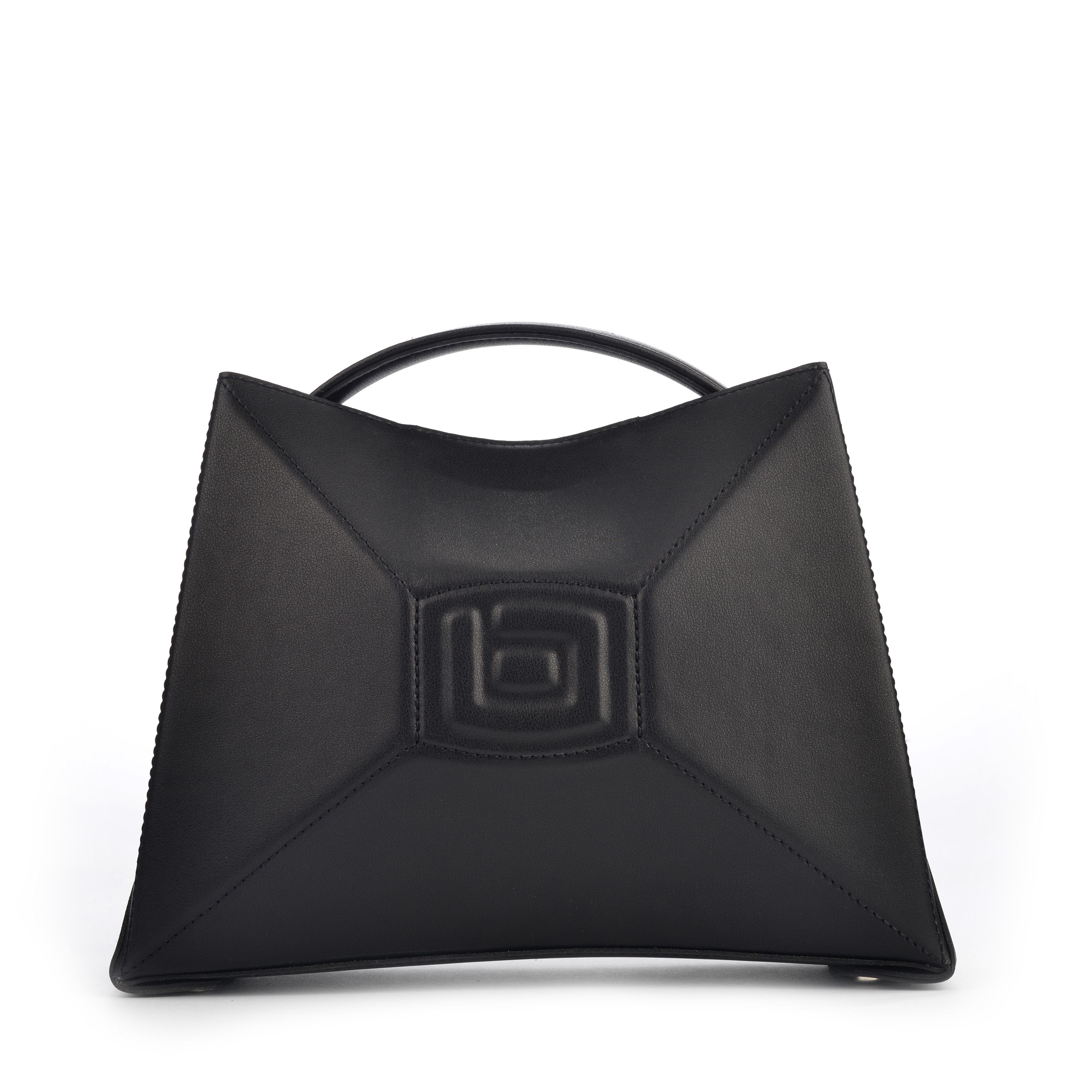 Сумка 3022 среднего размера из гладкой черной кожи оформлена в футуристическом стиле. Она имеет выпуклую форму с центральным элементом и гранями, а ее внутреннее пространство оснащено карманами. Один из них - большой карман-перегородка, который фиксируется с помощью хлястика с магнитом. Также имеется карман на молнии, в котором можно хранить мелкие предметы. Вмещает документы формата А5.