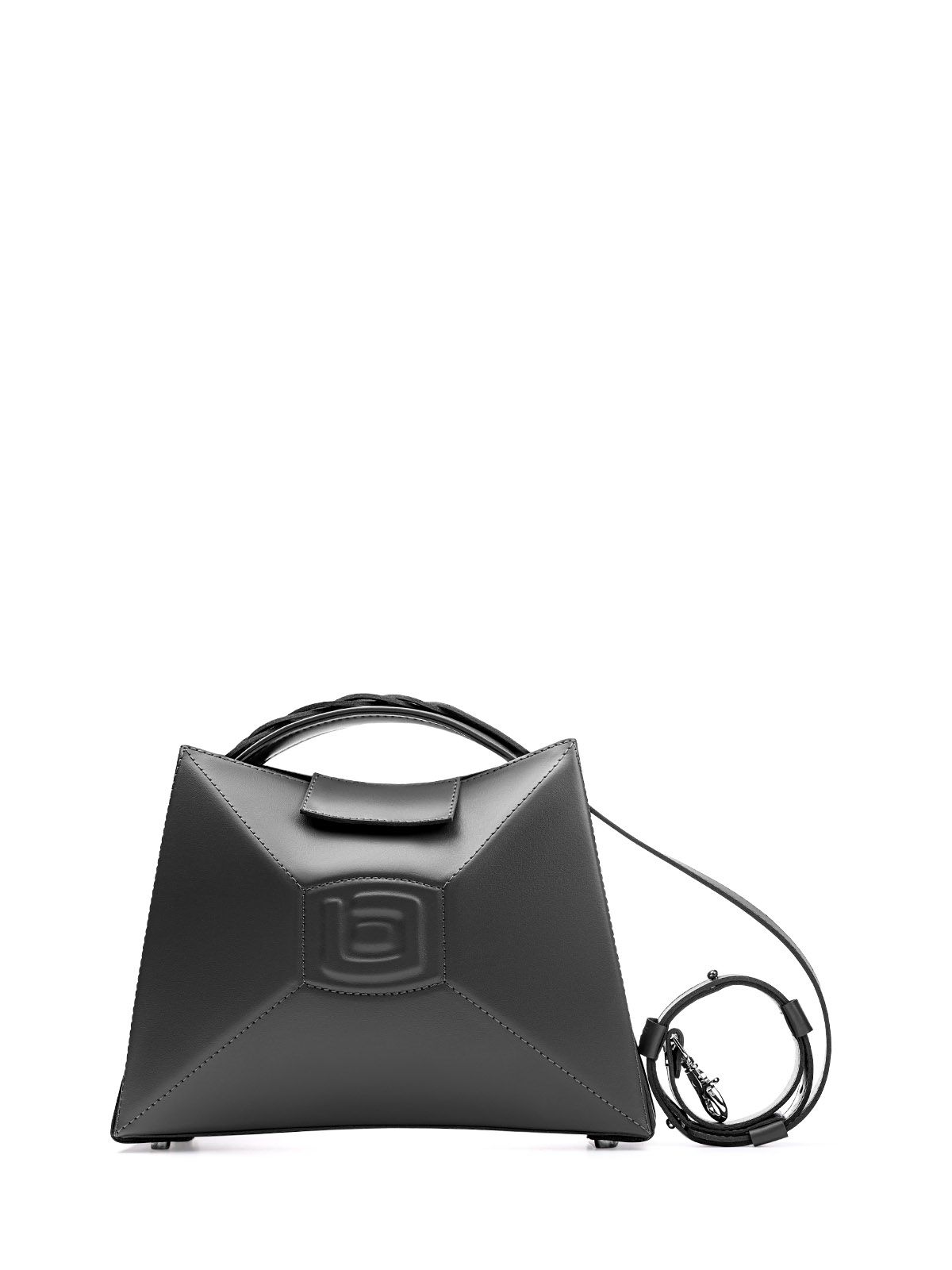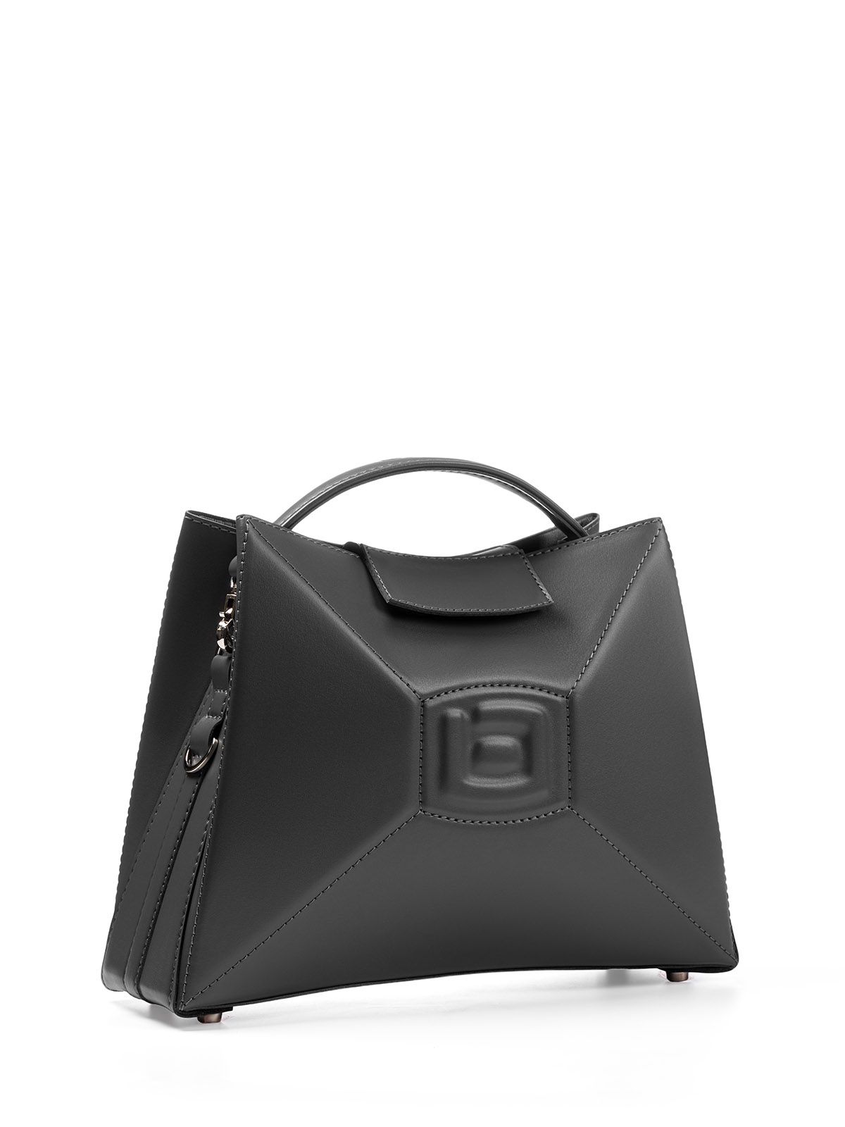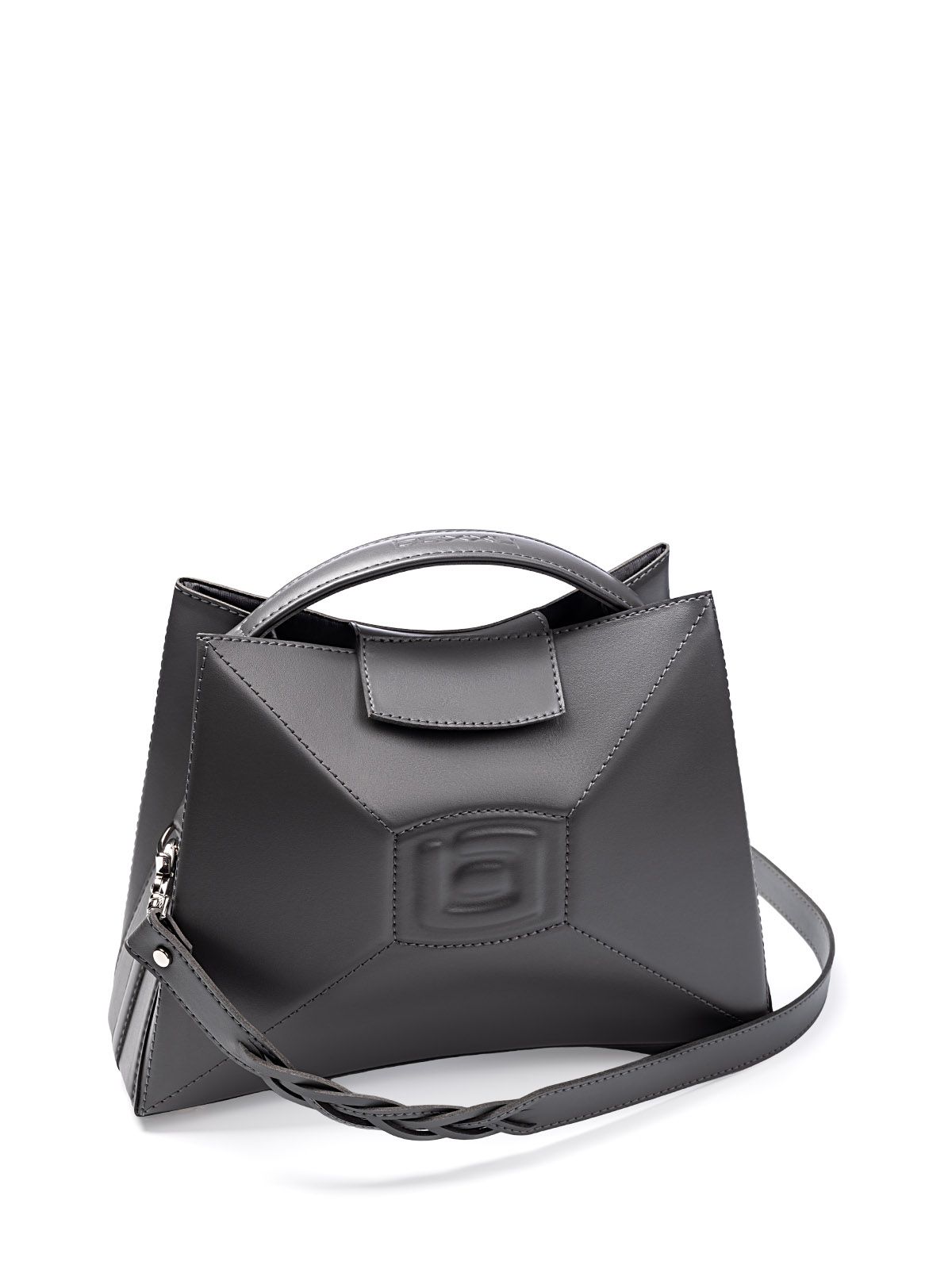 Сумка 3022 среднего размера из гладкой серой кожи оформлена в футуристическом стиле. Она имеет выпуклую форму с центральным элементом и гранями, а ее внутреннее пространство оснащено карманами. Один из них - большой карман-перегородка, который фиксируется с помощью хлястика с магнитом. Также имеется карман на молнии, в котором можно хранить мелкие предметы. Вмещает документы формата А5.