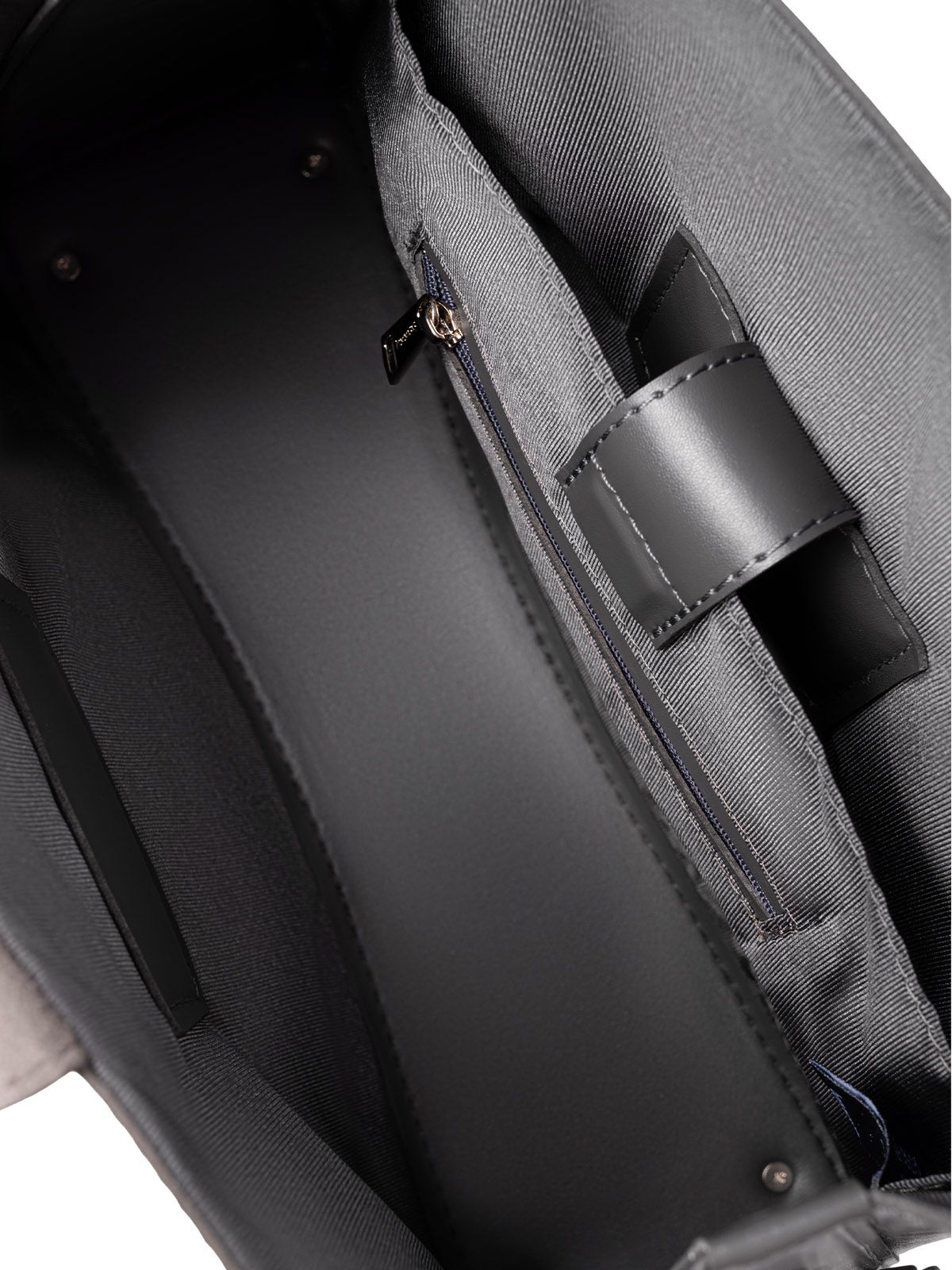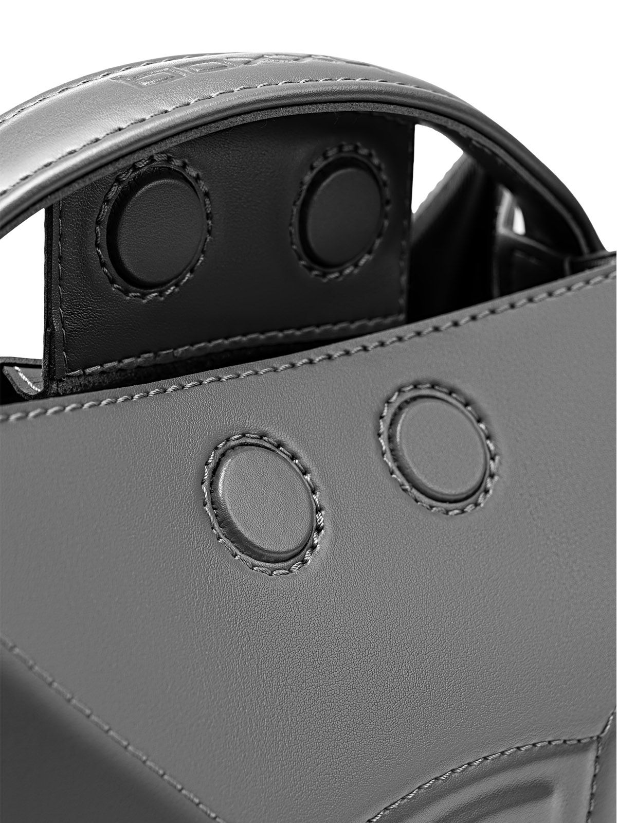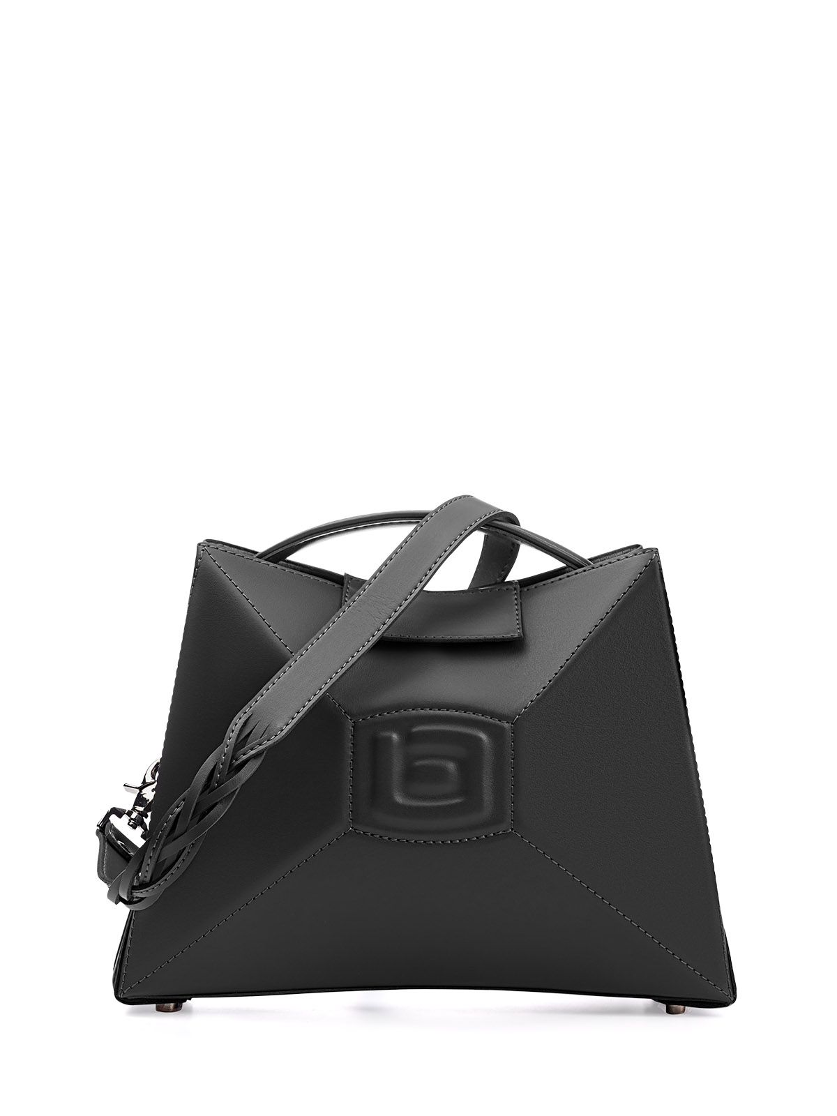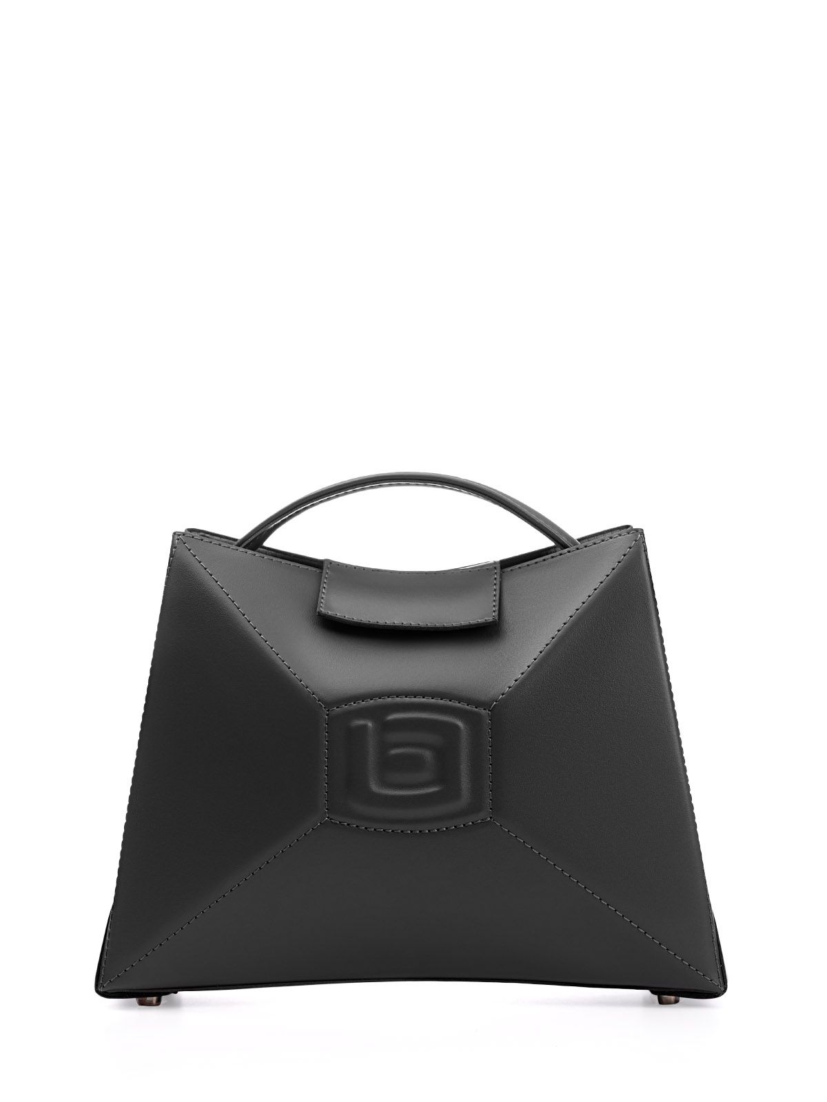 Сумка 3022 среднего размера из гладкой серой кожи оформлена в футуристическом стиле. Она имеет выпуклую форму с центральным элементом и гранями, а ее внутреннее пространство оснащено карманами. Один из них - большой карман-перегородка, который фиксируется с помощью хлястика с магнитом. Также имеется карман на молнии, в котором можно хранить мелкие предметы. Вмещает документы формата А5.