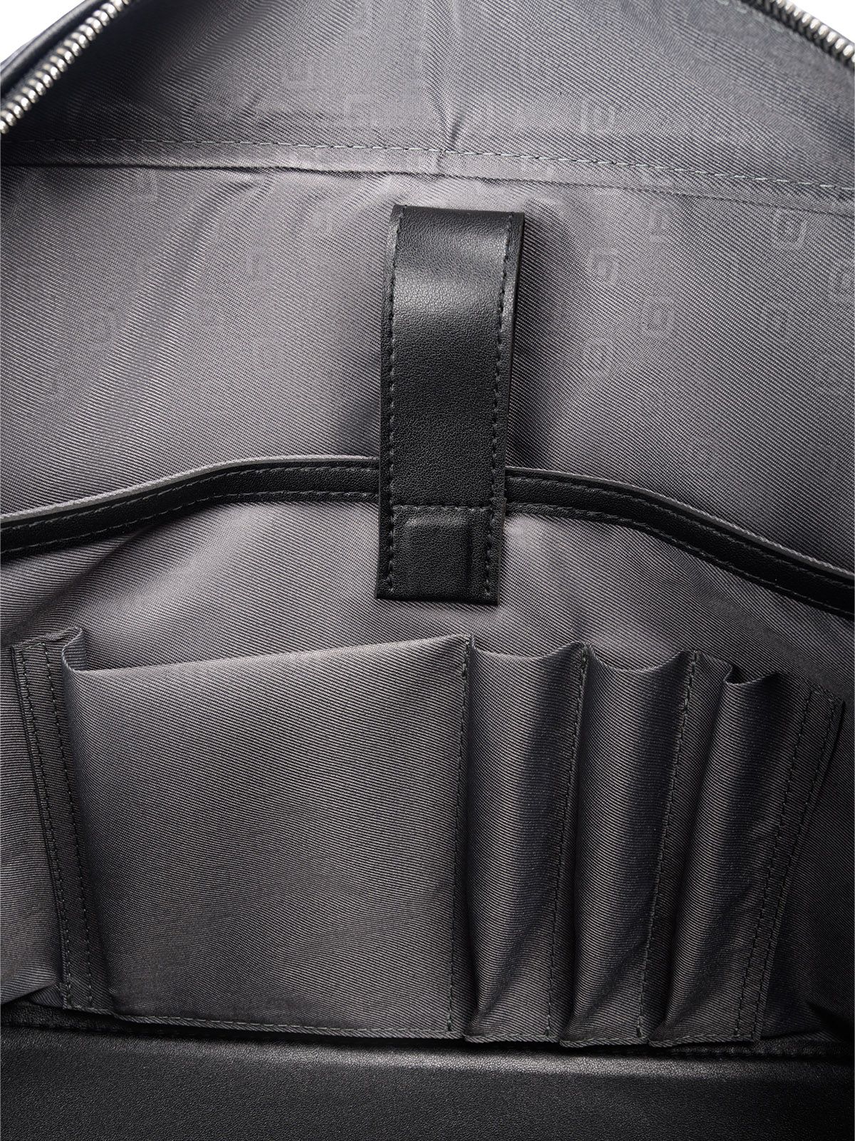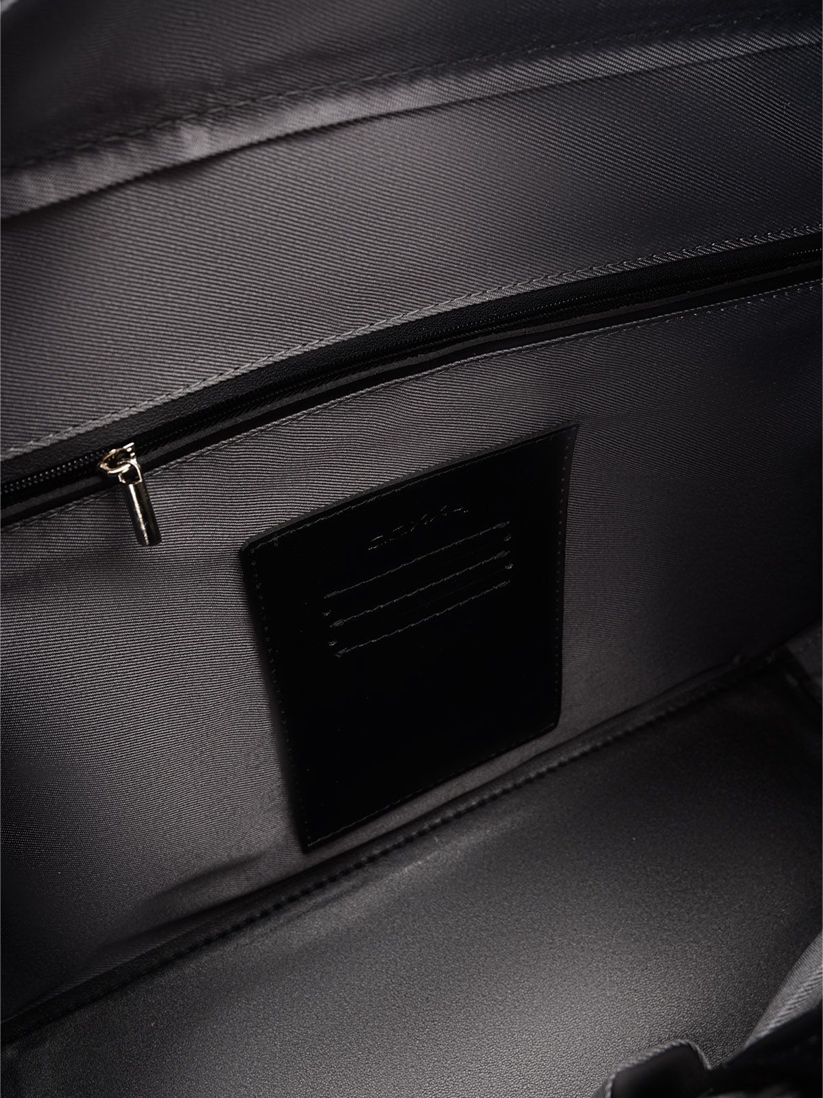 Внутри одно отделение. На передней стенке карман с молнией. На задней стенке накладной карман-перегородка, который закрывается на хлястик с магнитом.