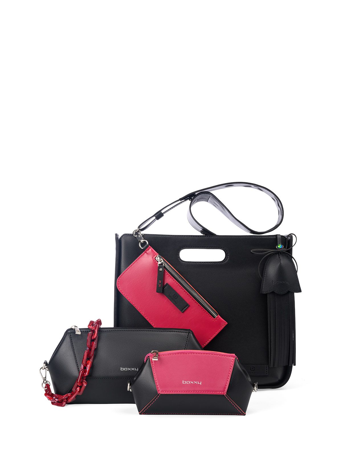 Капсульный набор аксессуаров в черно-розовой гамме.