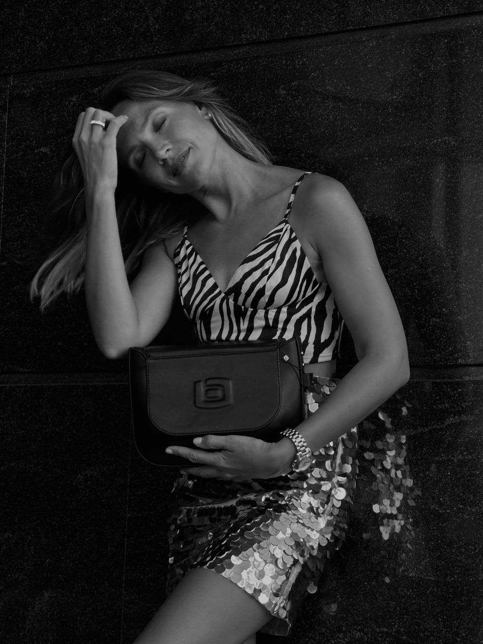 Закрывается на потайные магниты. На передней стенке объёмный декоративный логотип. На задней стенке накладной карман. Внутри одно отделение. На стенках подклада: кожанный накладной карман, карман на молнии.