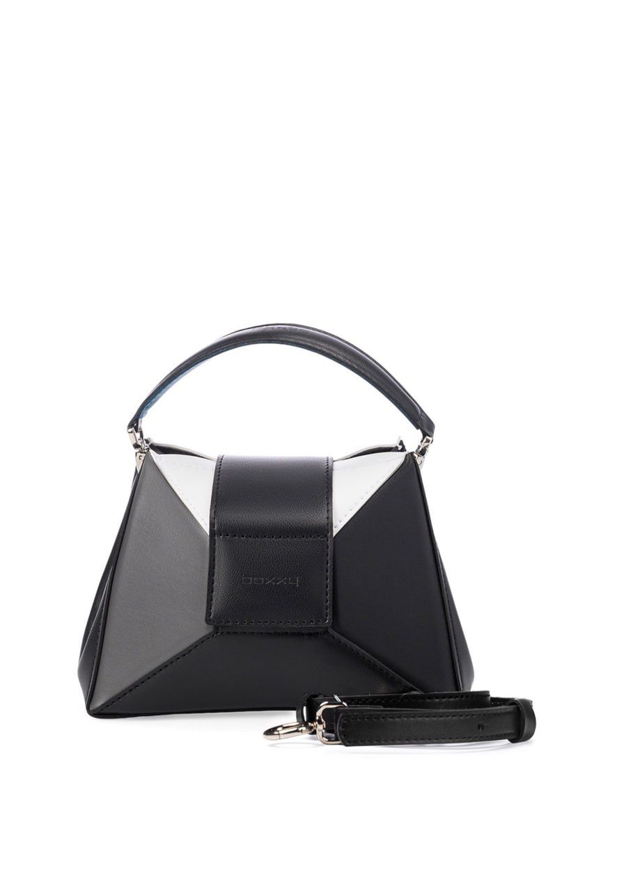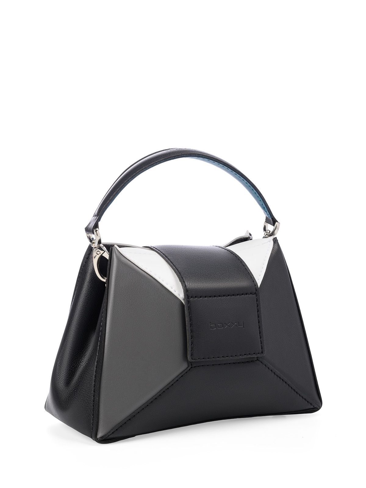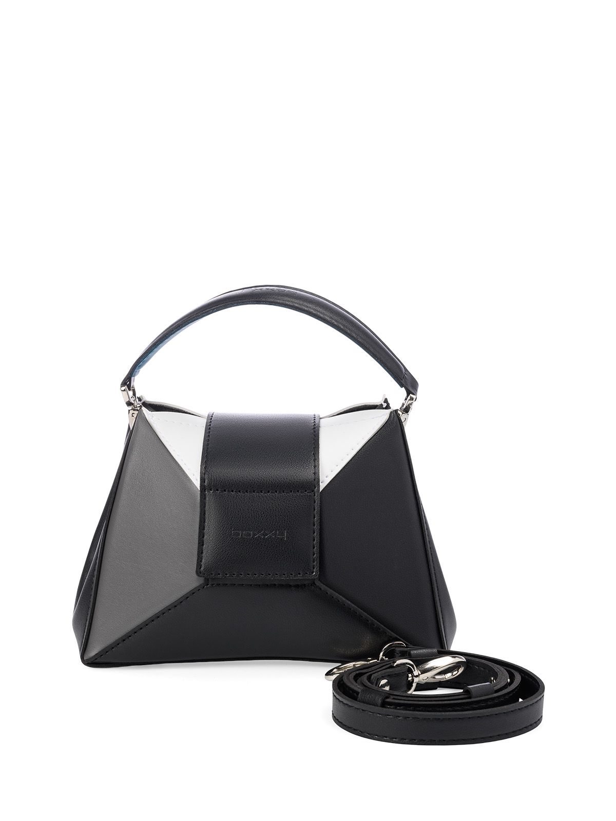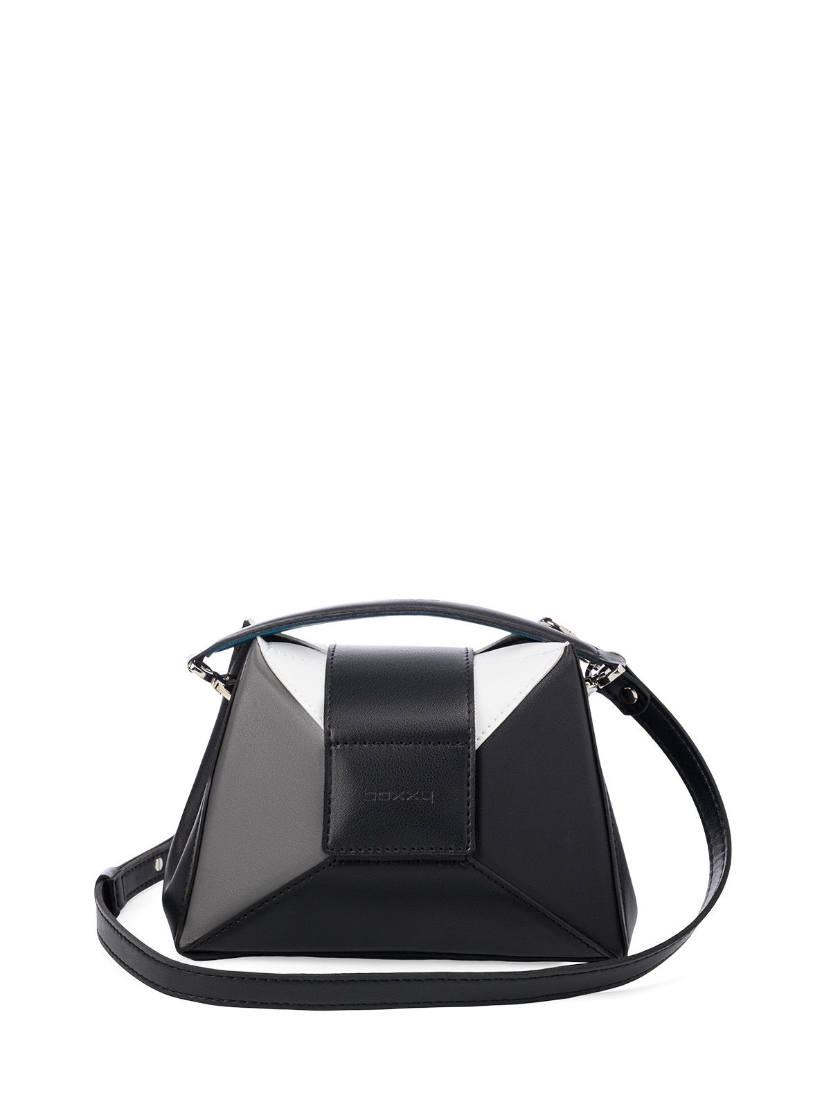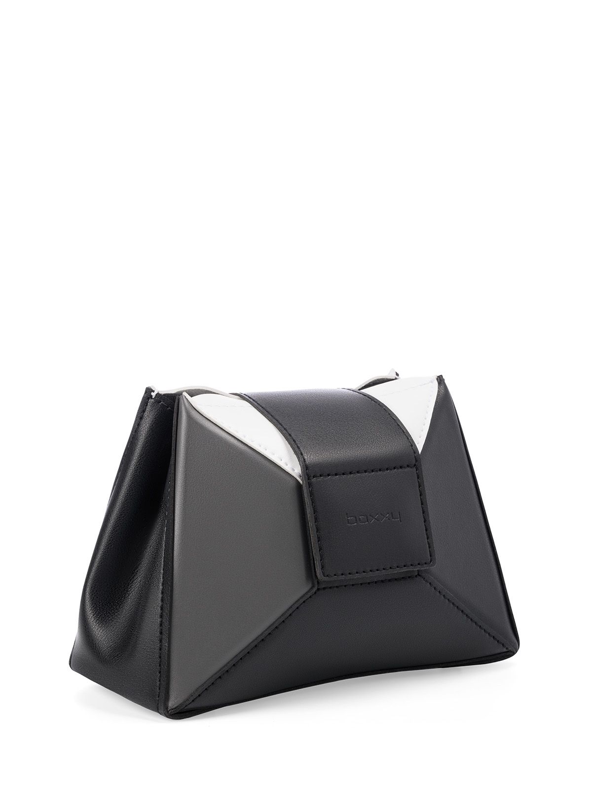 Сумка 3029 маленького размера из гладкой черной кожи оформлена в футуристическом стиле. Она имеет выпуклую форму с центральным элементом и гранями. Закрывается на хлястик с магнитом. На дне установлены металлические ножки (пукли). Внутри одно отделение. На стенках подклада: карман на резинке. В комплекте с сумкой входят: съёмный плечевой ремень, регулируемый до 110 см и съёмная ручка.