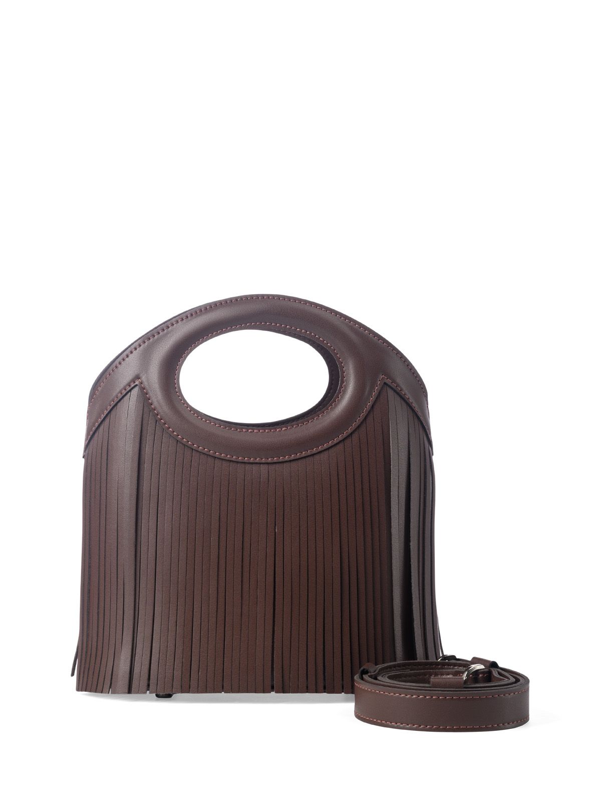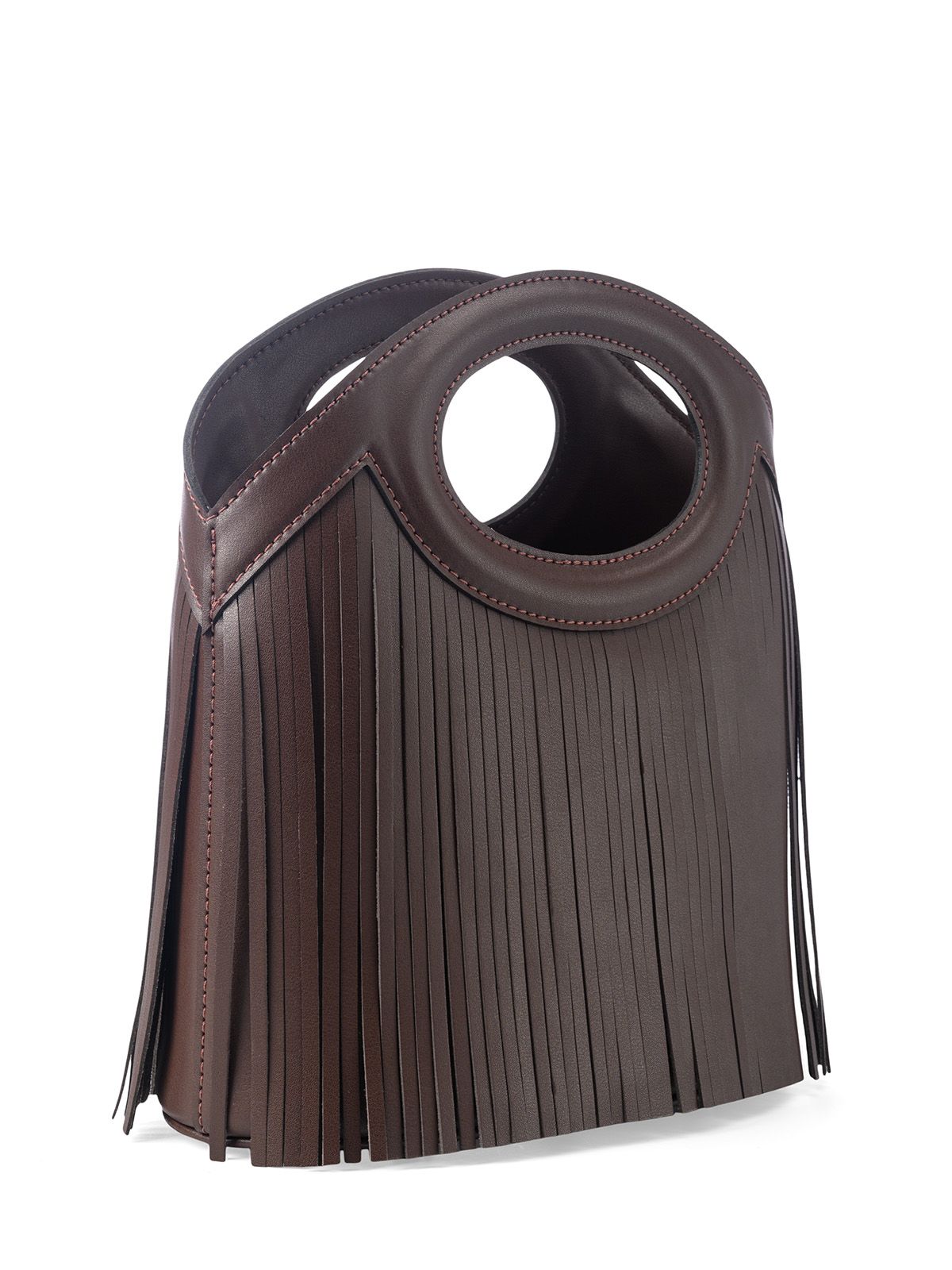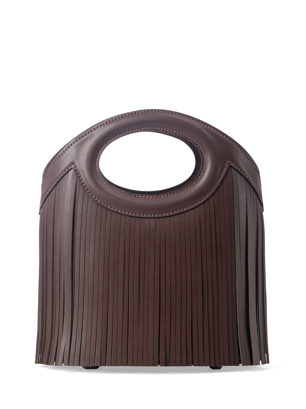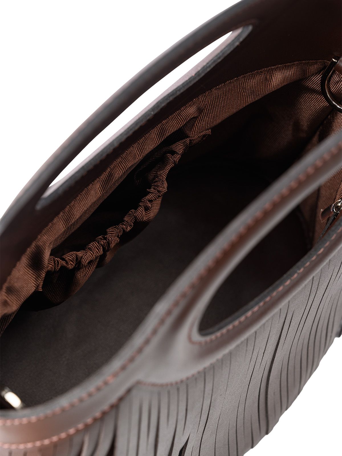 Сумка с бахромой маленького размера SHEBBY 3043. В верхней части прорубные отверстия-ручки овальной формы. Открытый верх без застёжки обеспечивает лёгкий доступ к содержимому. Внутри 2 кармана: накладной на резинке и карман на молнии. На передней и задней стенках декоративная кожаная бахрома. На дне сумки металлические ножки (пукли). В комплект входит съемный, регулируемый до 120 см, плечевой ремень.