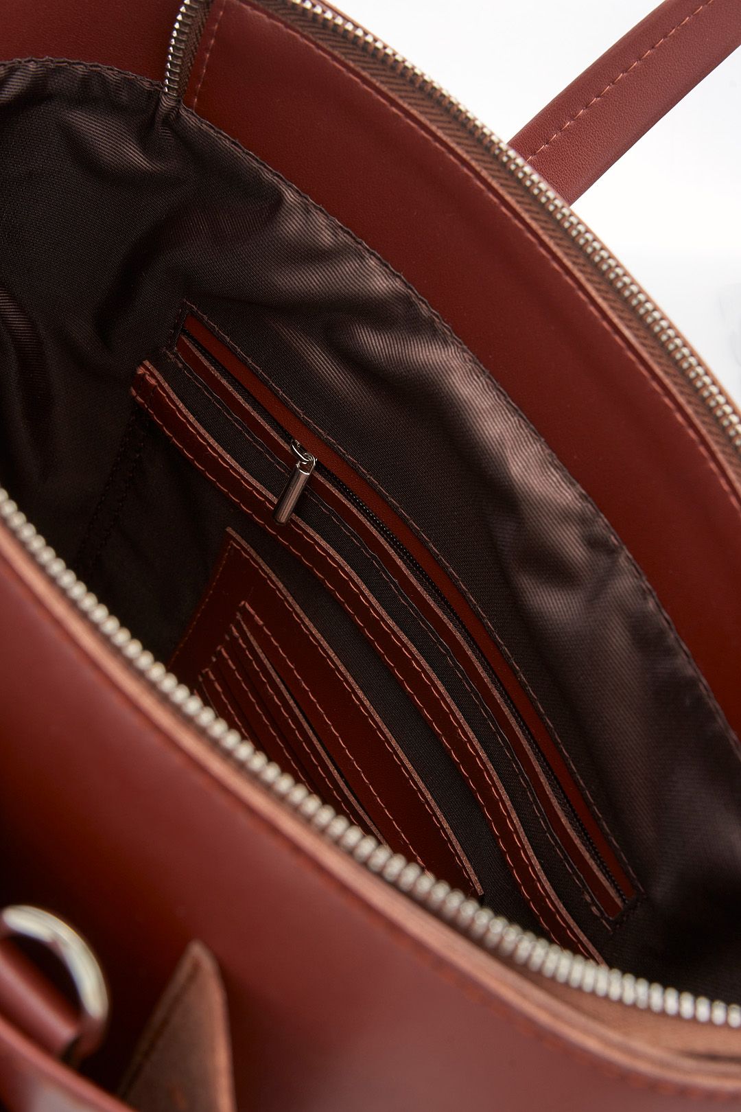 Закрывается на замок молнию. На передней и задней стенках накладные карманы на магнитных кнопках, которые вмещают в себя формат А5. На дне установлены ножки (пукли). Внутри одно отделение. На стенках подклада: карман накладной, карман на молнии, карман накладной с визитницей (под карточки).