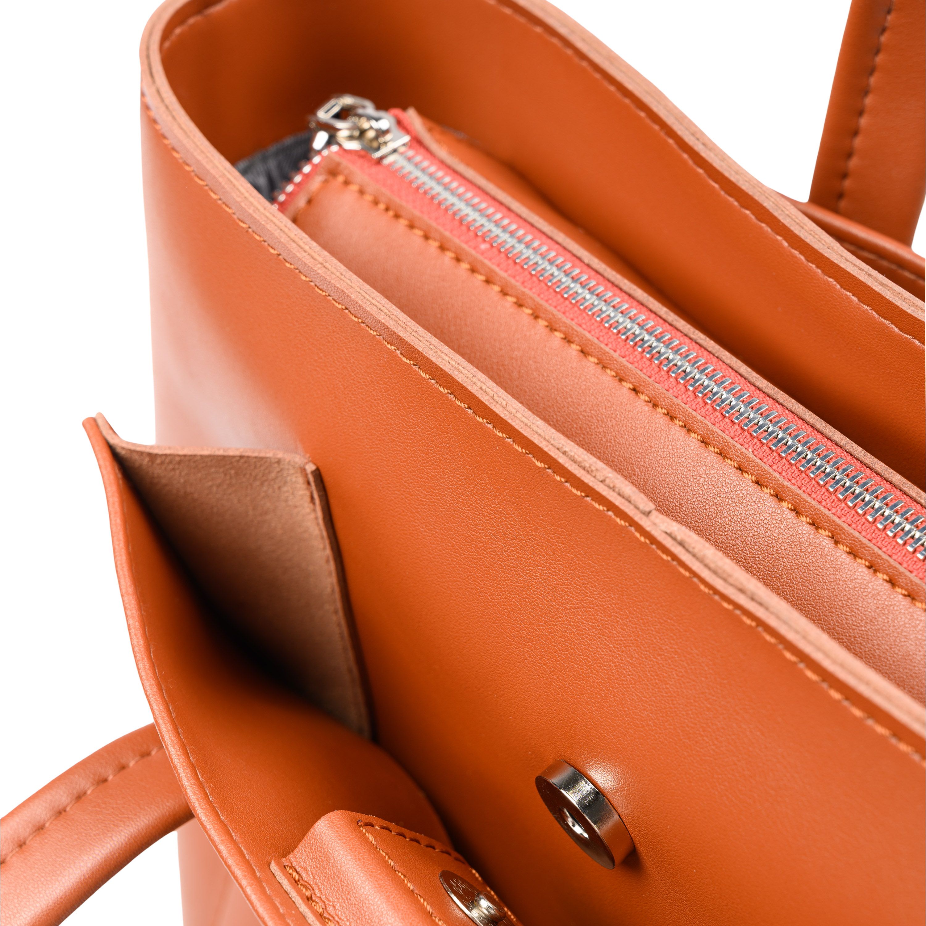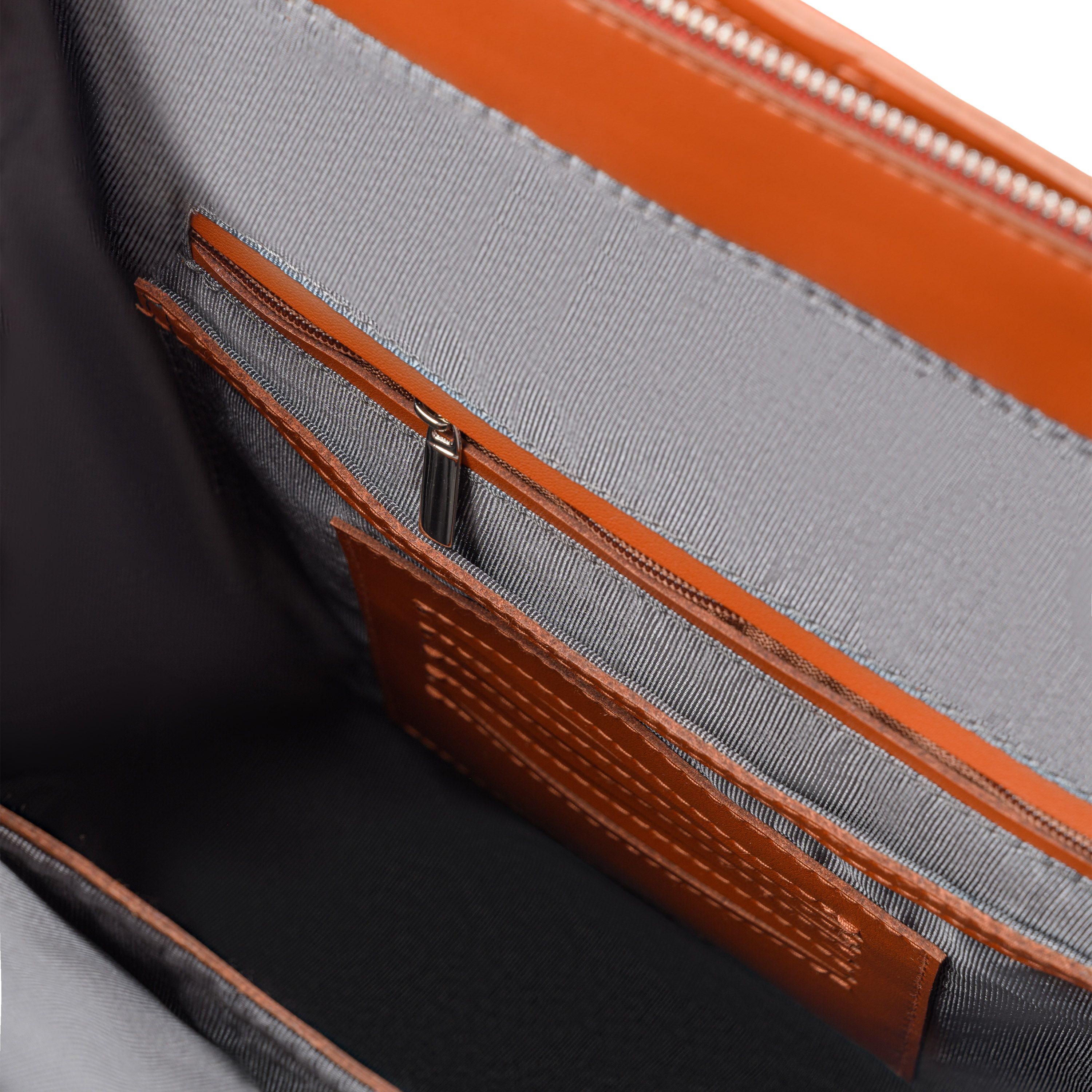 Закрывается на замок молнию. На передней и задней стенках накладные карманы на магнитных кнопках, которые вмещают в себя формат А5. На дне установлены ножки (пукли). Внутри одно отделение. На стенках подклада: карман накладной, карман на молнии, карман накладной с визитницей (под карточки).